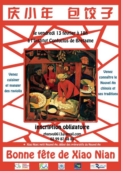 L’institut Confucius de Bretagne organise le vendredi13 février à 18h, un atelier culinaire pour la fête de Xiao Nian.Vous pourrez découvrir le Nouvel An Chinois , et ces tradition.Ainsi que déguster et cuisiner des raviolis chinois.